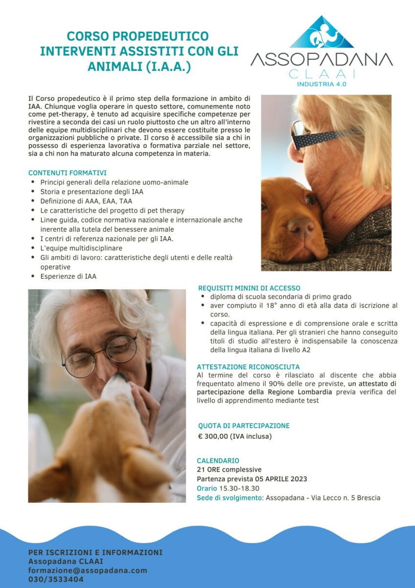 Il Corso propedeutico è il primo step della formazione in ambito di IAA. Chiunque voglia operare in questo settore, comunemente noto come pet-therapy, è tenuto ad acquisire specifiche competenze per rivestire a seconda dei casi un ruolo piuttosto che un altro all’interno delle equipe multidisciplinari che devono essere costituite presso le organizzazioni pubbliche o private. Il corso è accessibile sia a chi in possesso di esperienza lavorativa o formativa parziale nel settore, sia a chi non ha maturato alcuna competenza in materia.