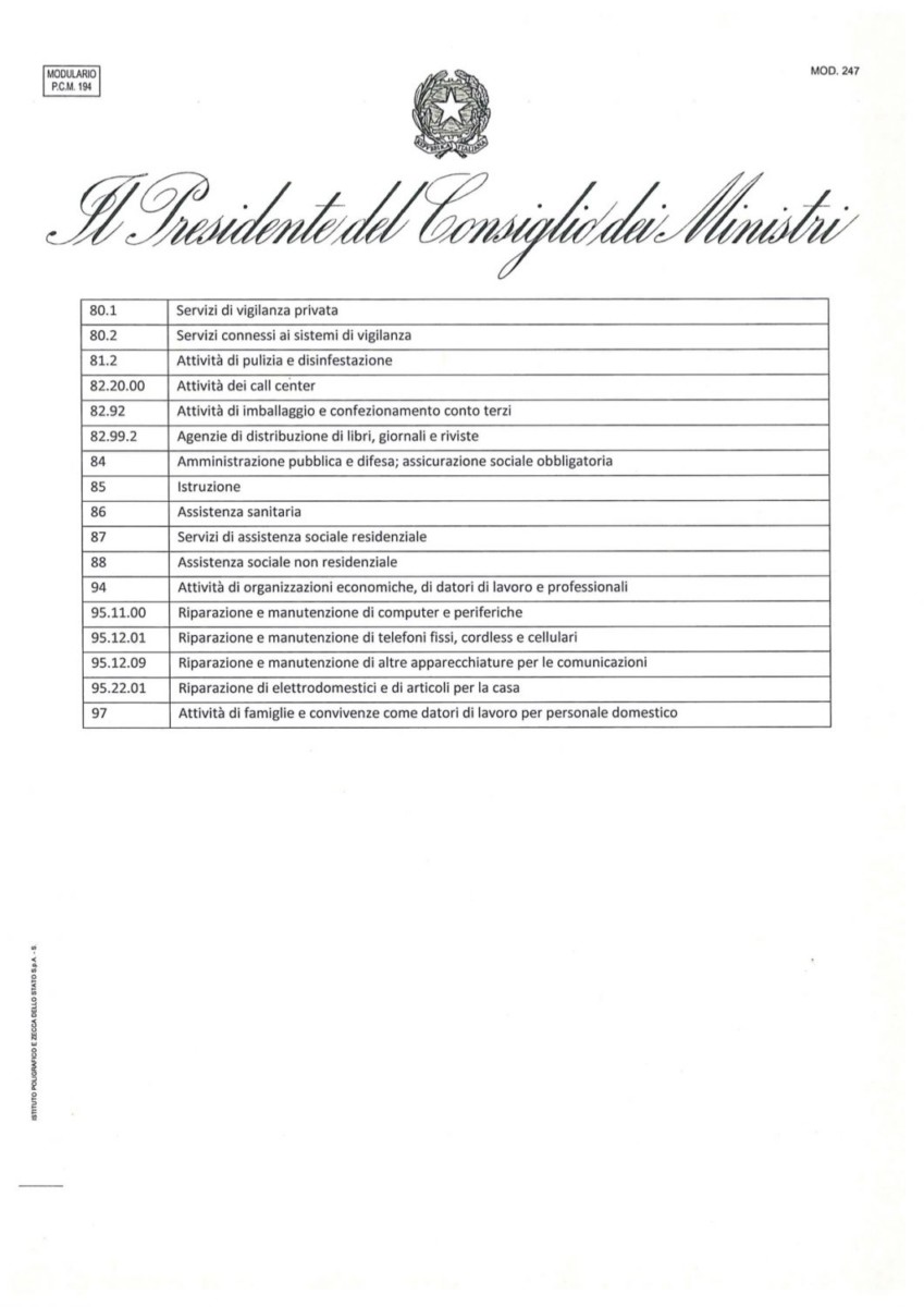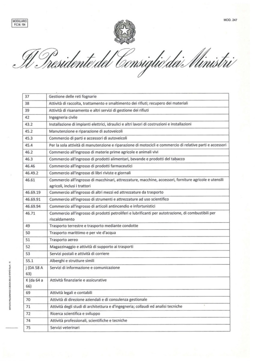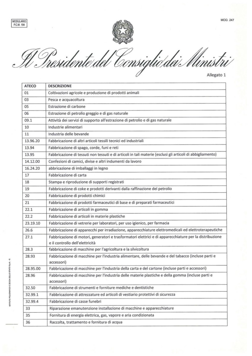 Di seguito l’elenco completo delle attività artigianali e commerciali che potranno rimanere aperte. Sulla colonna di sinistra è indicato il codice ATECO.